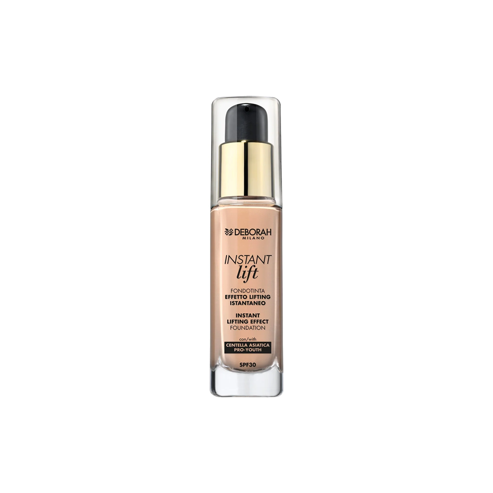 Instantly delivers a radiant, rested, visibly lifted appearance. Light-reflecting soft-focus powders give skin a luminous overall evenness, concealing the tell-tale signs of ageing. Deborah Instant Lift Foundation is formulated with a blend of vitamins and Centella, commonly known as Asiatic pennywort, to hydrate skin and leave it smooth and supple. The sublimely weightless liquid consistency suits all skin tones. Long-wearing. SPF30. Dermatologist tested. Instant lifting effect.