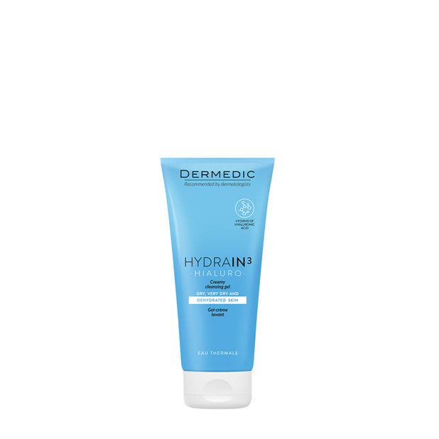 Removes make-up and all impurities. Without SLS and SLES – does not irritate the skin and leaves its natural hydro-lipid layer intact. Hypoallergenic. Recommended for sensitive, dry or very dry facial skin. Mild surfactants (with no SLS and no SLES) and thermal water cleanse the skin very gently. Dermedic Hydrain3 Hialuro Creamy Cleansing Gel 200ml does not dehydrate the skin.