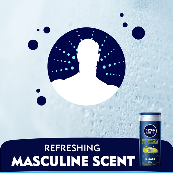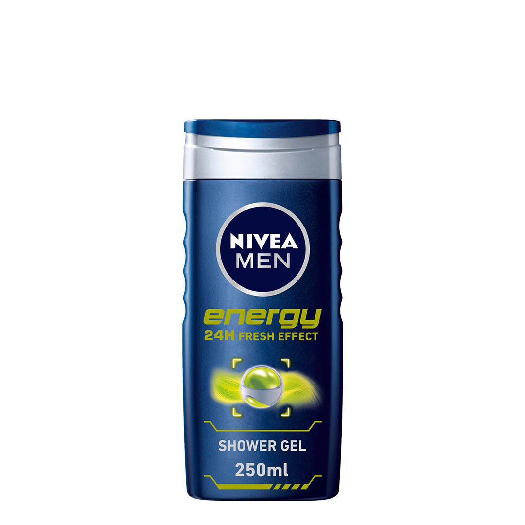 Face every day with energy. NIVEA MEN Energy Shower Gel leaves your body, face and hair feeling refreshed and cared for. The caring formula with its fresh masculine scent provides your skin with long-lasting freshness. Work hard, play hard? Face every day with energy. Simply apply the shower gel to your wet skin. Massage it onto your body, face and hair before rinsing it off.