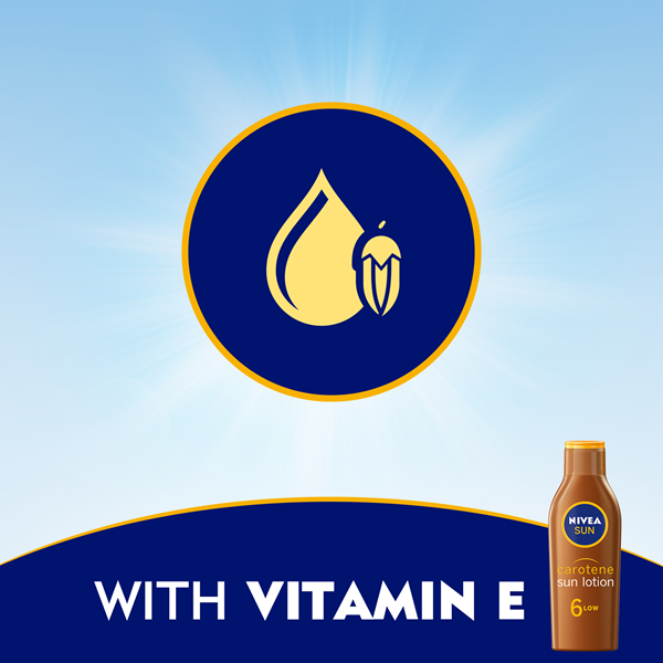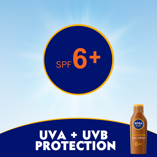 Nivea Sun-Carotene Sun-Lotion SPF6 provides UVA/UVB protection. Also protects against sunburn with SPF 6 and helps even the skin to achieve a beautiful golden tan.