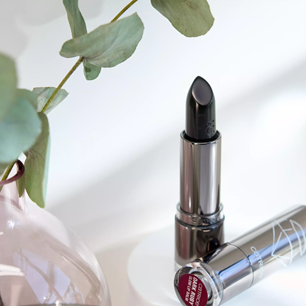Catrice Dark Ruby Glow Lip Balm surprises with a black texture that reacts to the pH value of the lips. Turning into a dark red.