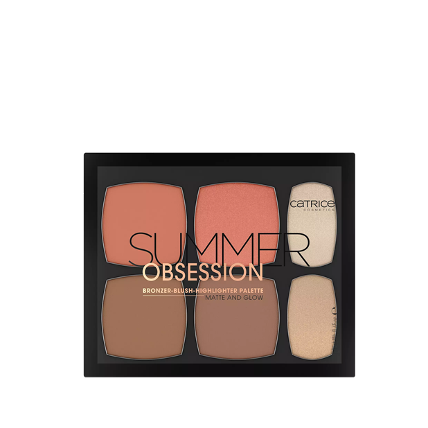 A sun-kissed complexion in seconds? Not a problem with Catrice Summer Obsession Bronzer Blush Highlighter Palette Matte and Glow. Blush, Bronzer & Highlighter Palette. Contains 2 matte bronzing shades, 1 matte and 1 glowy blush shade and 2 glowy highlighter shades. Suits every skin tone. For a perfectly defined complexion.