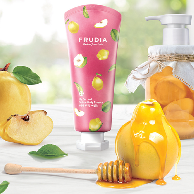 Frudia Orchard Quince Body Essence 200ml softens body and protects against dryness while leaving subtle fresh fruity scent. Enriched with quince extract, honey and aloe vera leaf juice, this relaxing body essence absorbs quickly. It leaves your skin velvety soft and fruity scented with the gentle scent of quince.